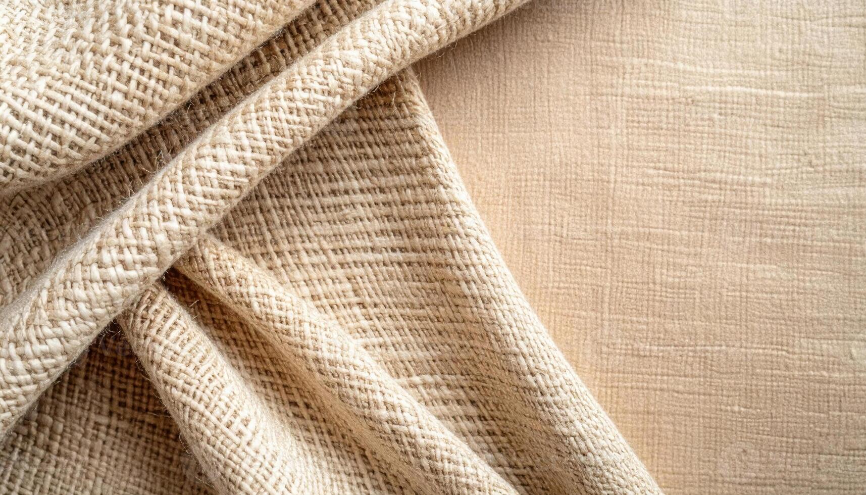 Elegant beige fabric drapes gracefully, displaying a subtle textured pattern with delicate folds and a soft, neutral color palette in macro view. Pro Photo