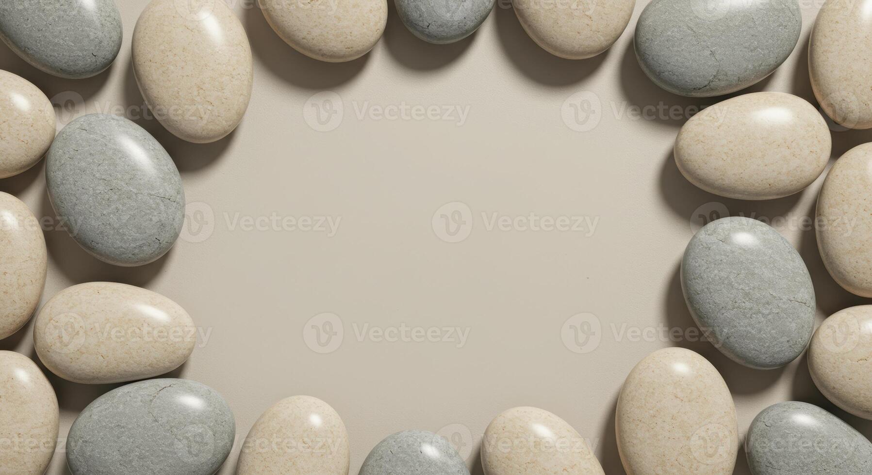 Smooth pebbles are arranged around a blank space providing a natural frame for text or images on a neutral background surface in studio. Pro Photo