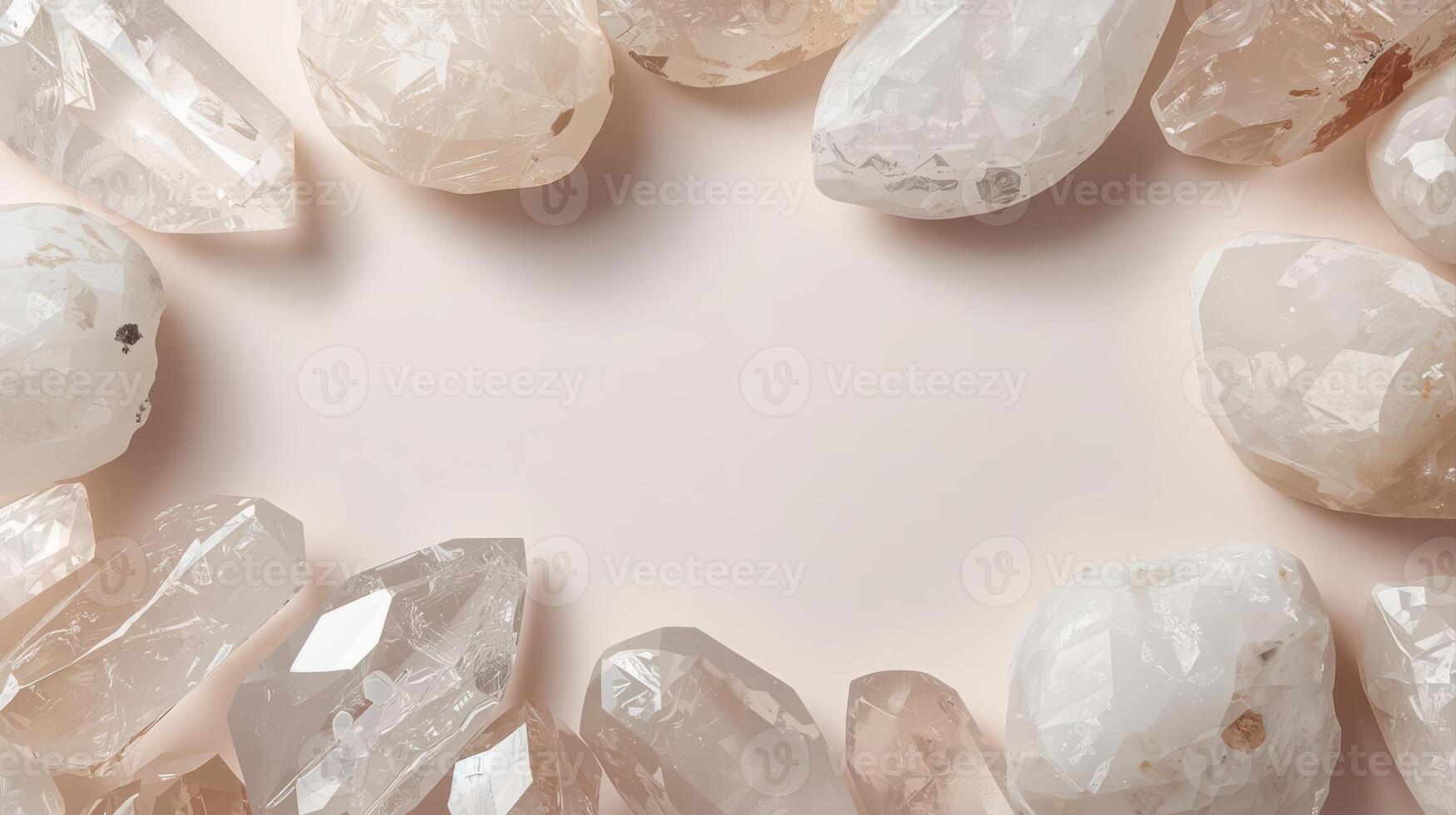 Collection of clear quartz crystals arranged around a light tan background provides a neutral frame for text and graphic design projects. Pro Photo