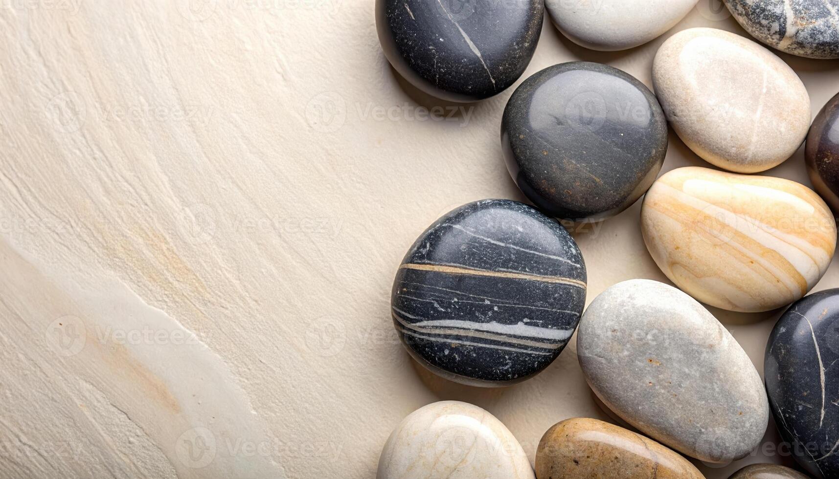 Polished smooth stones are arranged on a light beige textured surface to create a zen and calming spa or wellness background image. Pro Photo