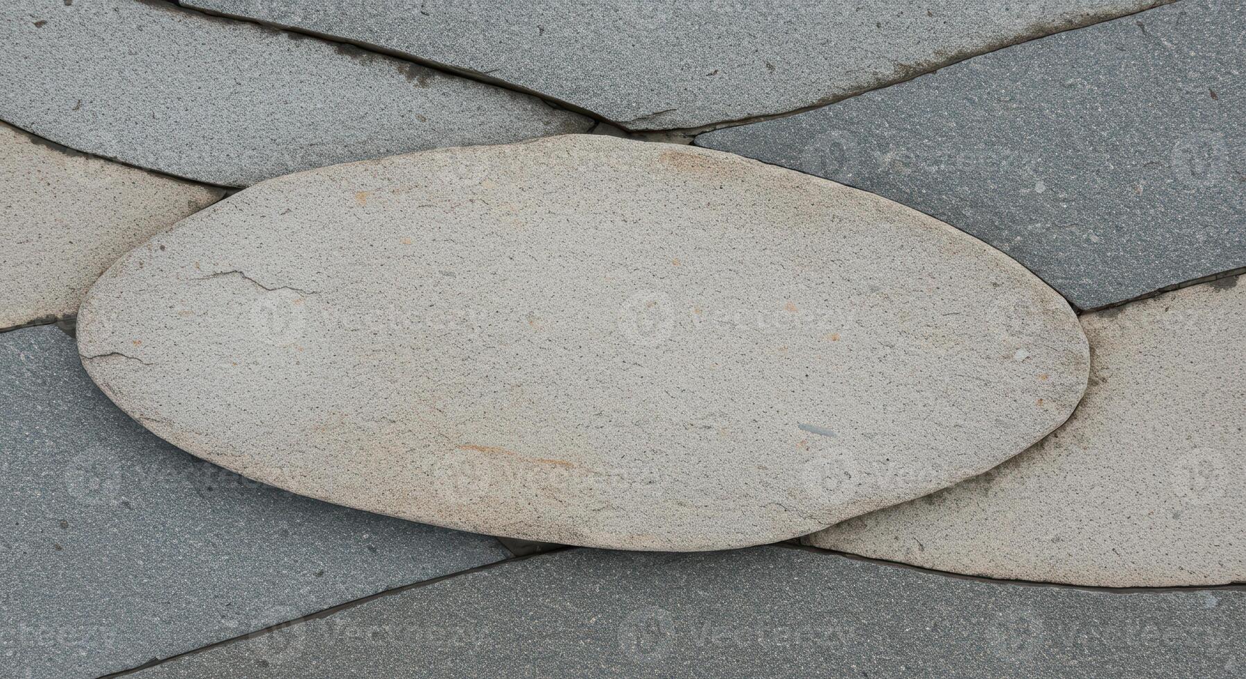 An abstract stone floor showing an oval stone surrounded by grey stones in an overlapping pattern creating a natural textured surface. Pro Photo