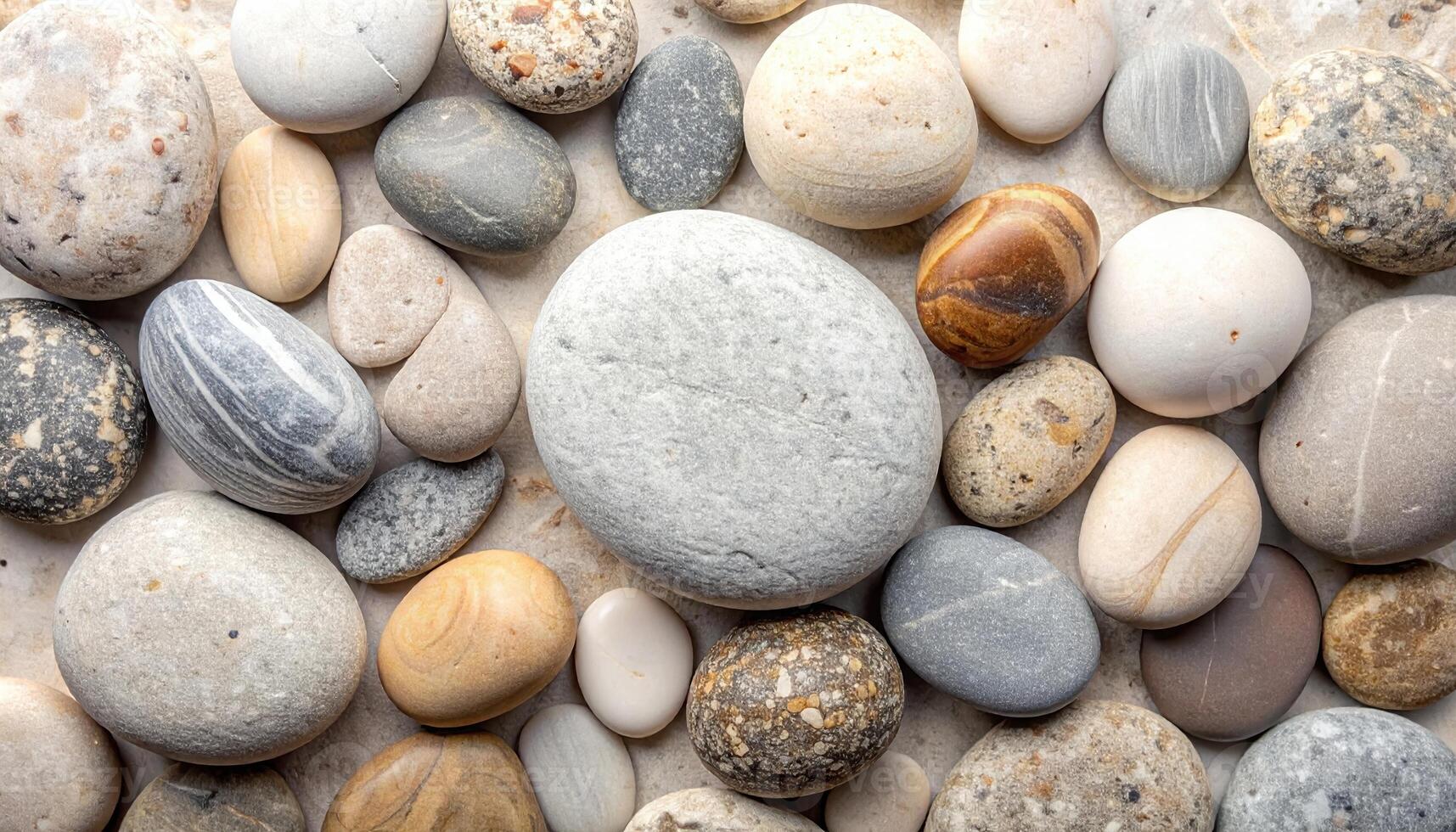 A collection of smooth, rounded pebbles in varied neutral tones and textures creates an organic and visually appealing natural pattern backdrop. Pro Photo