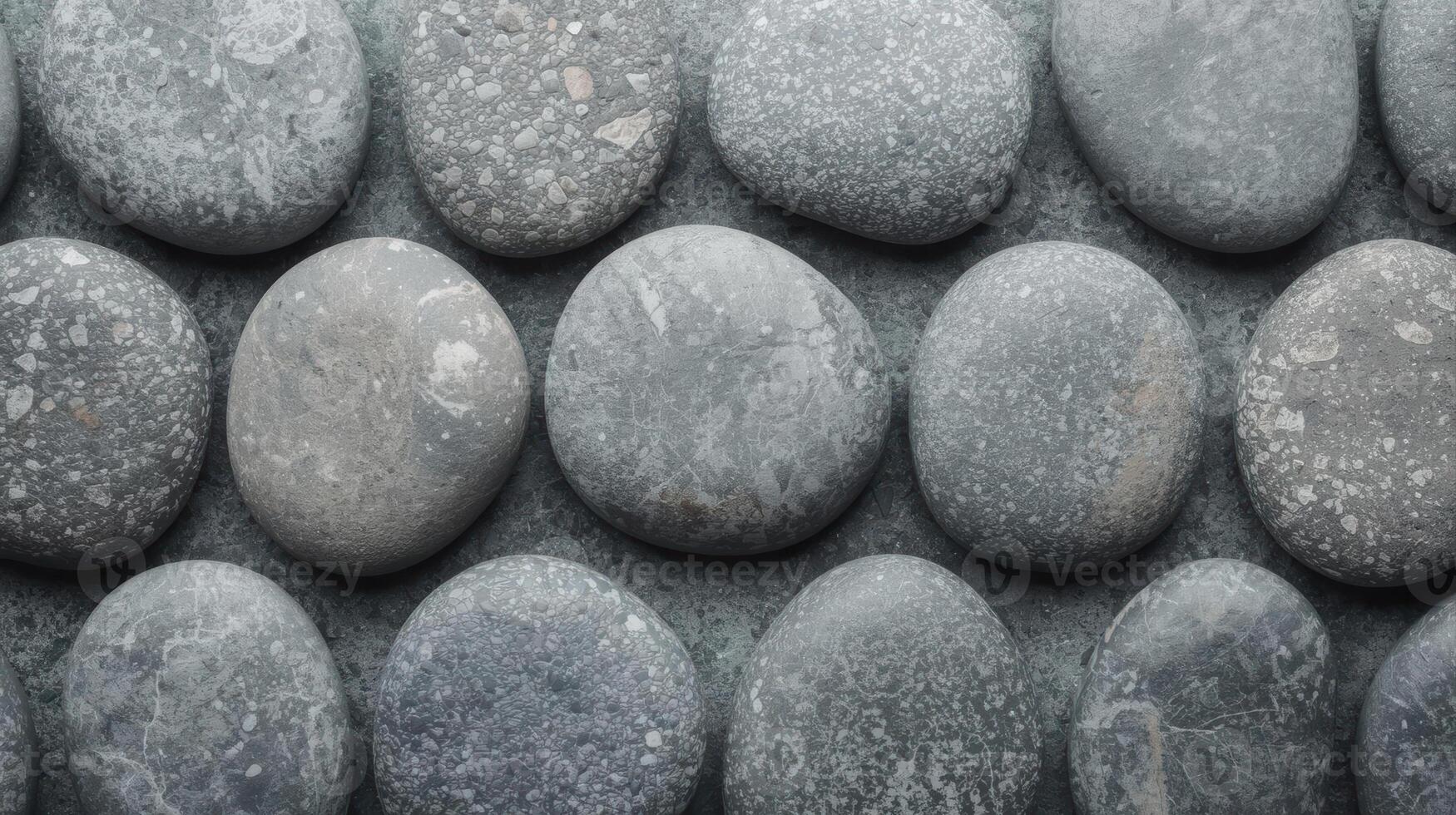 An array of smooth gray stones in neat rows creates a calming and natural pattern, perfect for backgrounds or textures, evoking zen and peace. Pro Photo