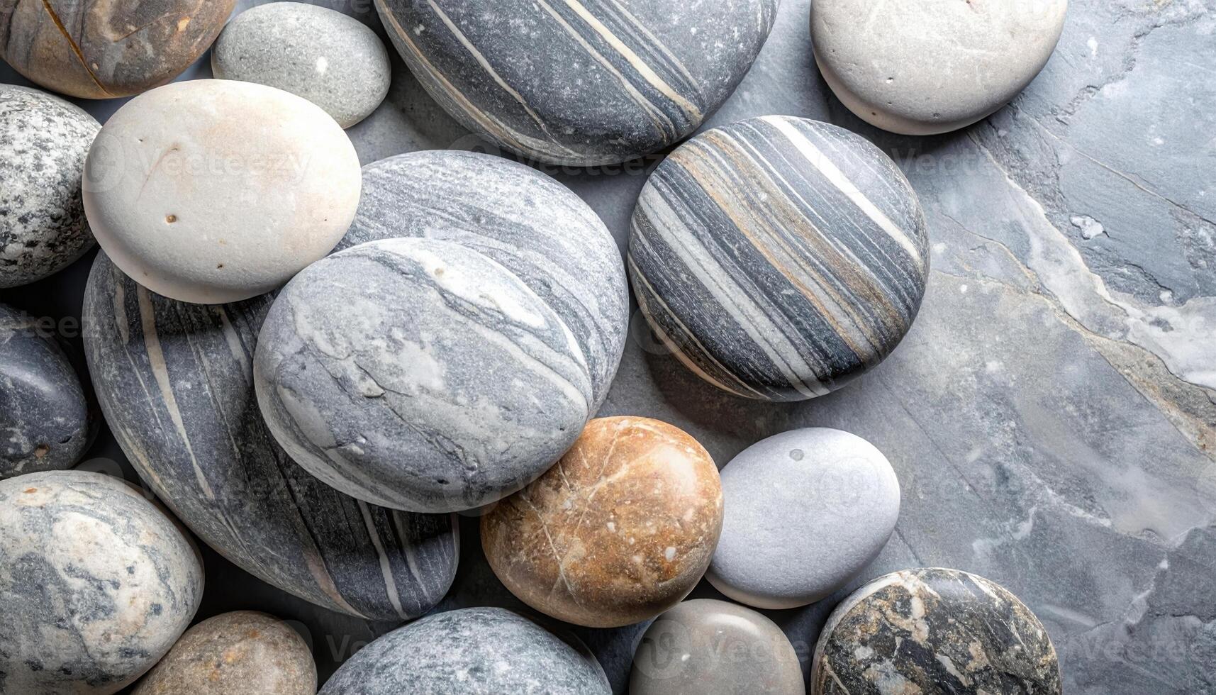 An overhead shot reveals a collection of smooth, rounded stones with diverse colors and patterns resting on a mottled stone surface background. Pro Photo