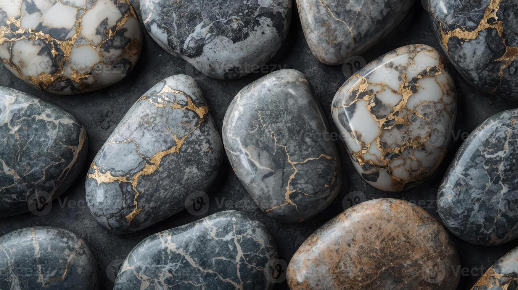 Close-up view shows gray stones with golden veins creating an abstract pattern, providing a textured natural artistic aesthetic backdrop. Pro Photo