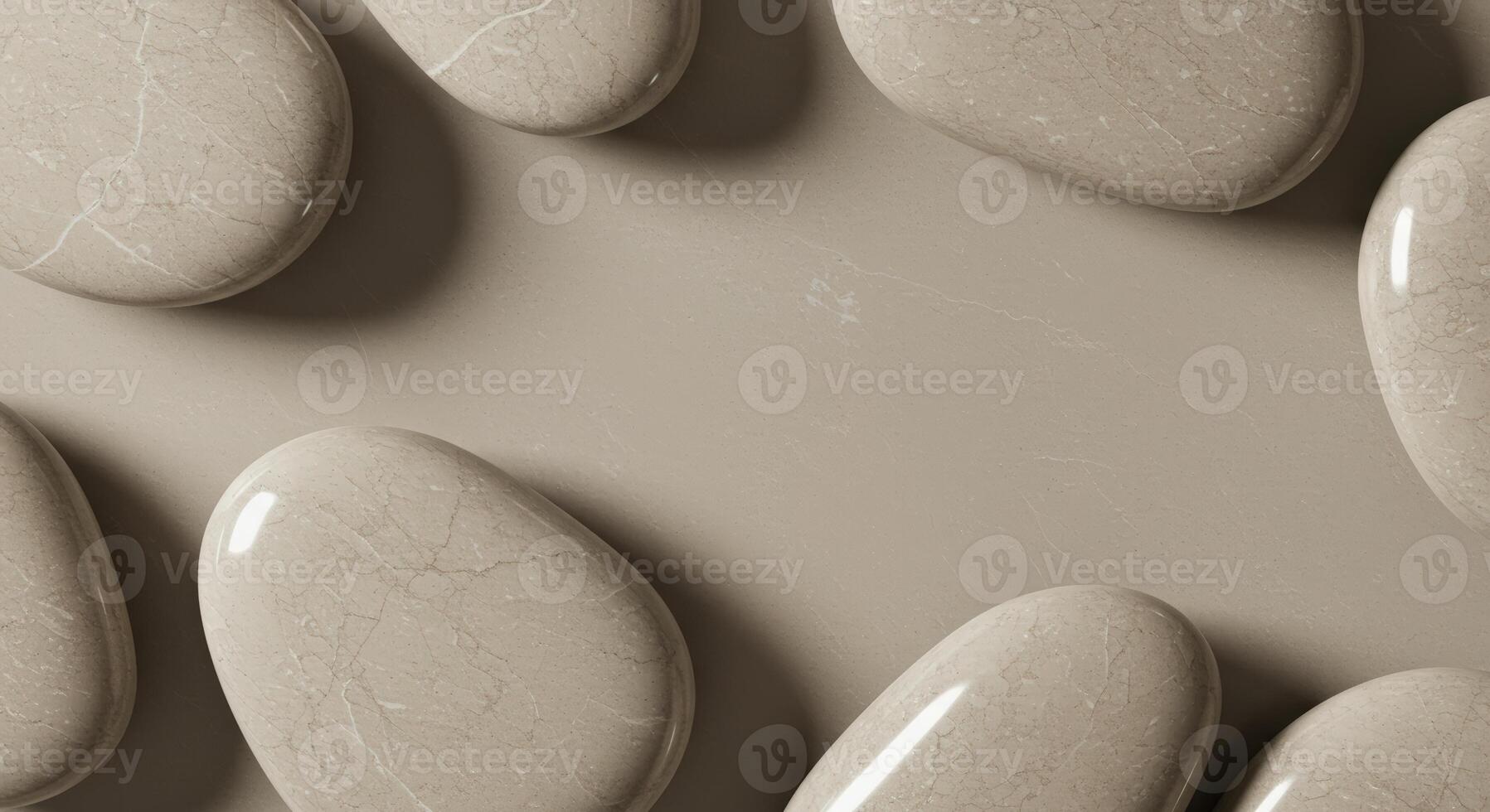Smooth beige pebbles are arranged around a neutral background to create a calming and natural organic frame for text or copy space. Pro Photo
