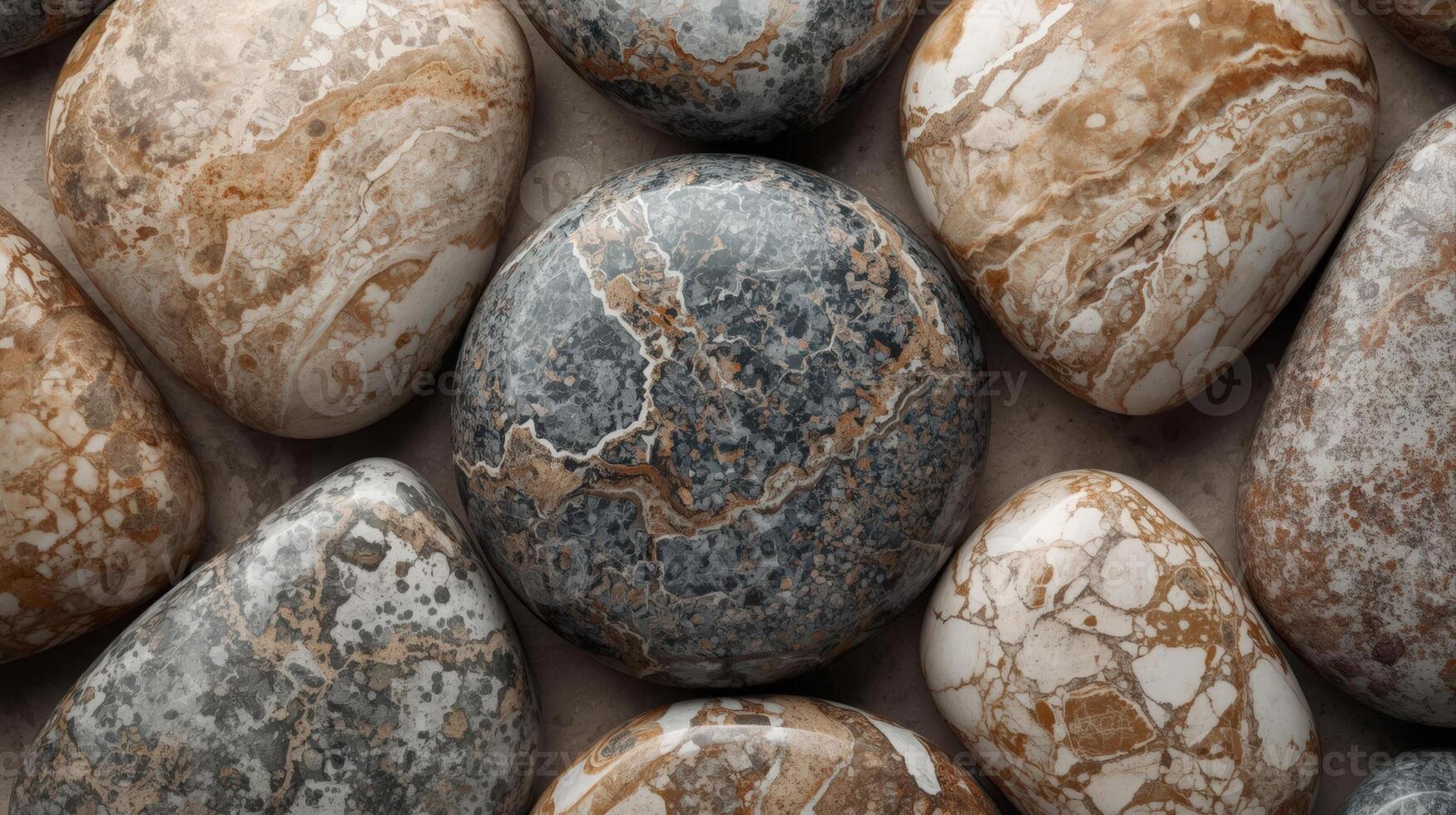 Smooth round stones with intricate natural patterns are arranged closely together, creating a textured and visually appealing composition. Pro Photo