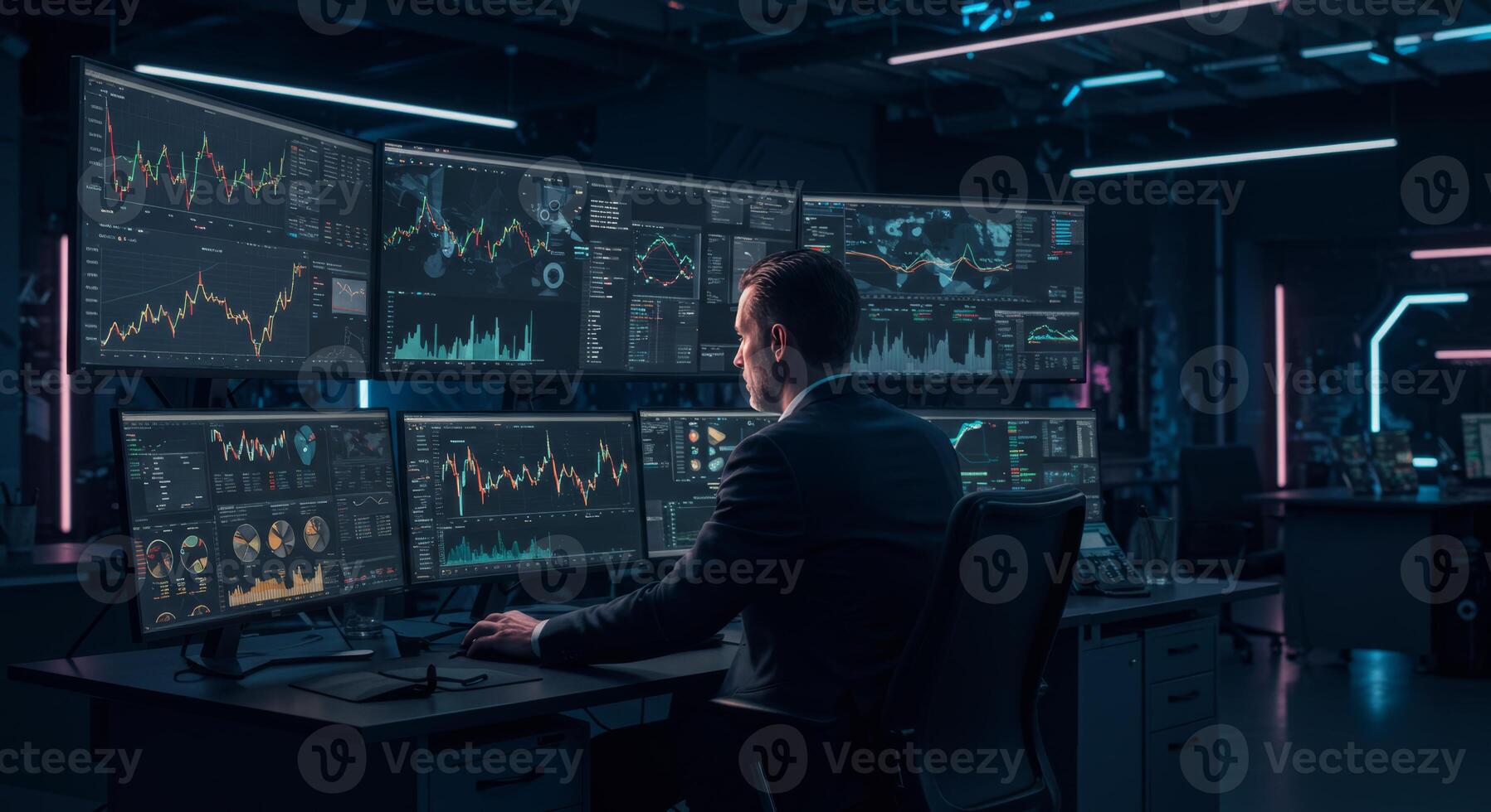 Financial Trader Analyzing Stock Market Data on Multiple Screens in Office Pro Photo