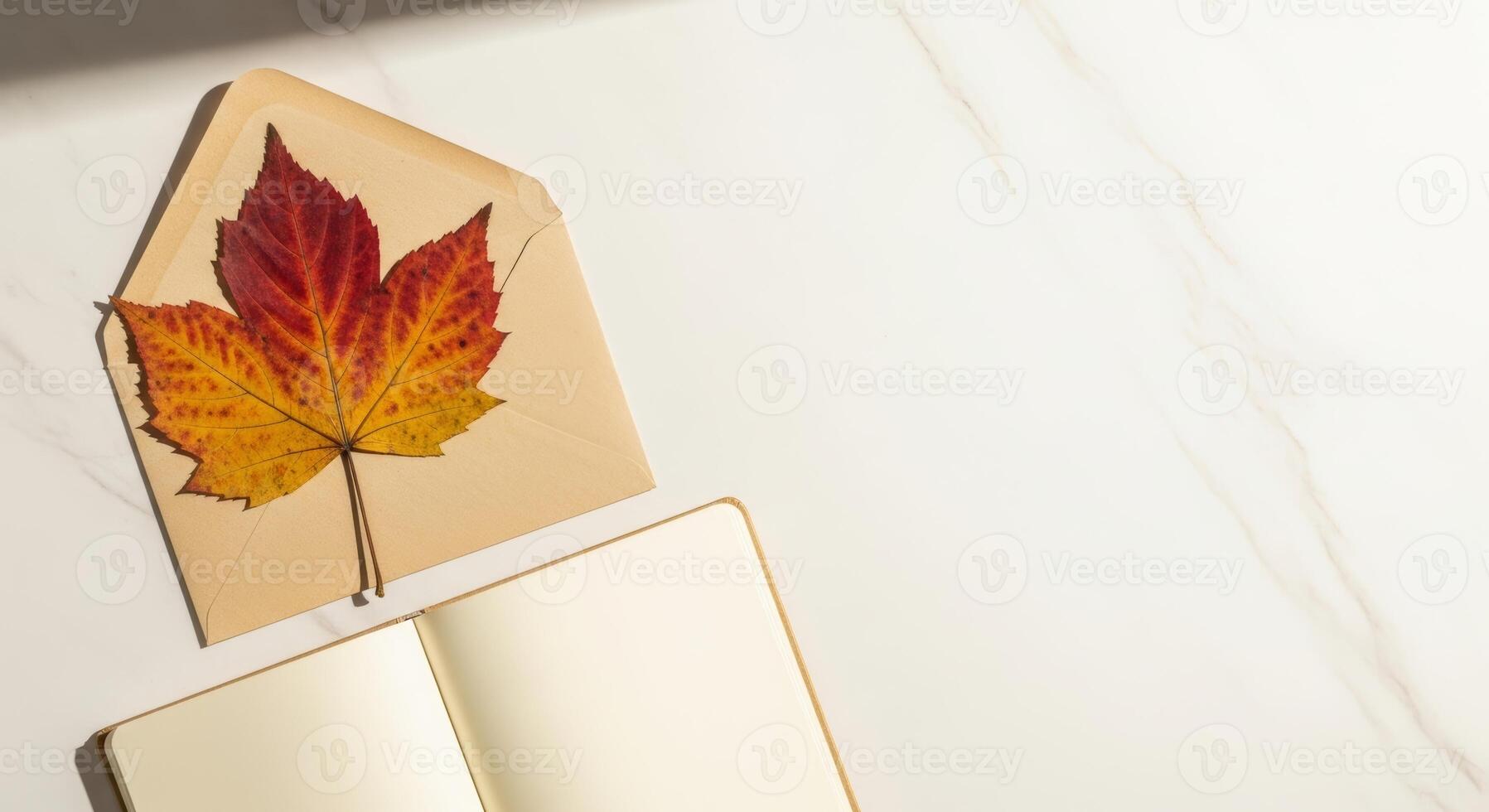 Autumn Flat Lay with Maple Leaf, Envelope, and Blank Notebook. Pro Photo