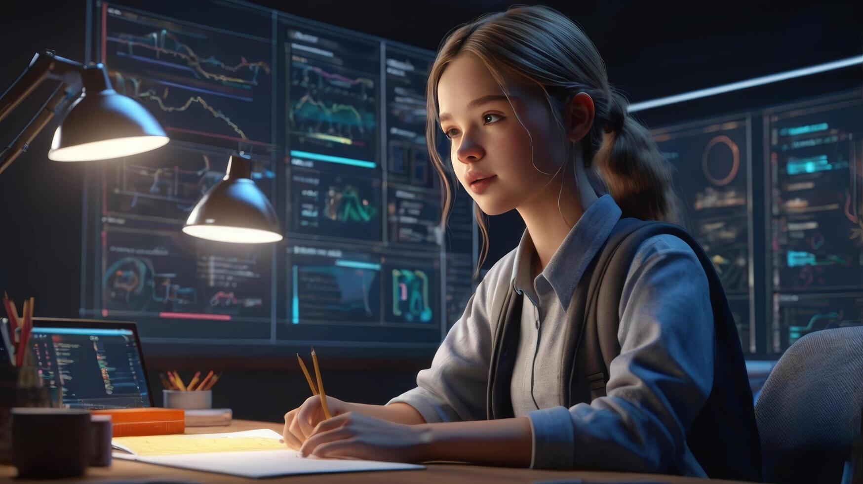 Young professional analyzing complex data displayed on multiple screens in modern workspace photo