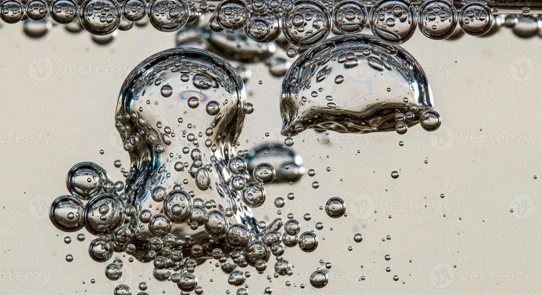Close up macro shot of numerous tiny and large bubbles rising and forming in clear liquid creating a dynamic underwater scene Pro Photo