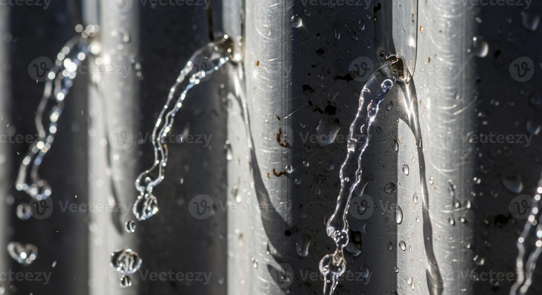 Water streams cascading down corrugated metal sheets creating a dynamic abstract pattern with droplets and reflections Pro Photo