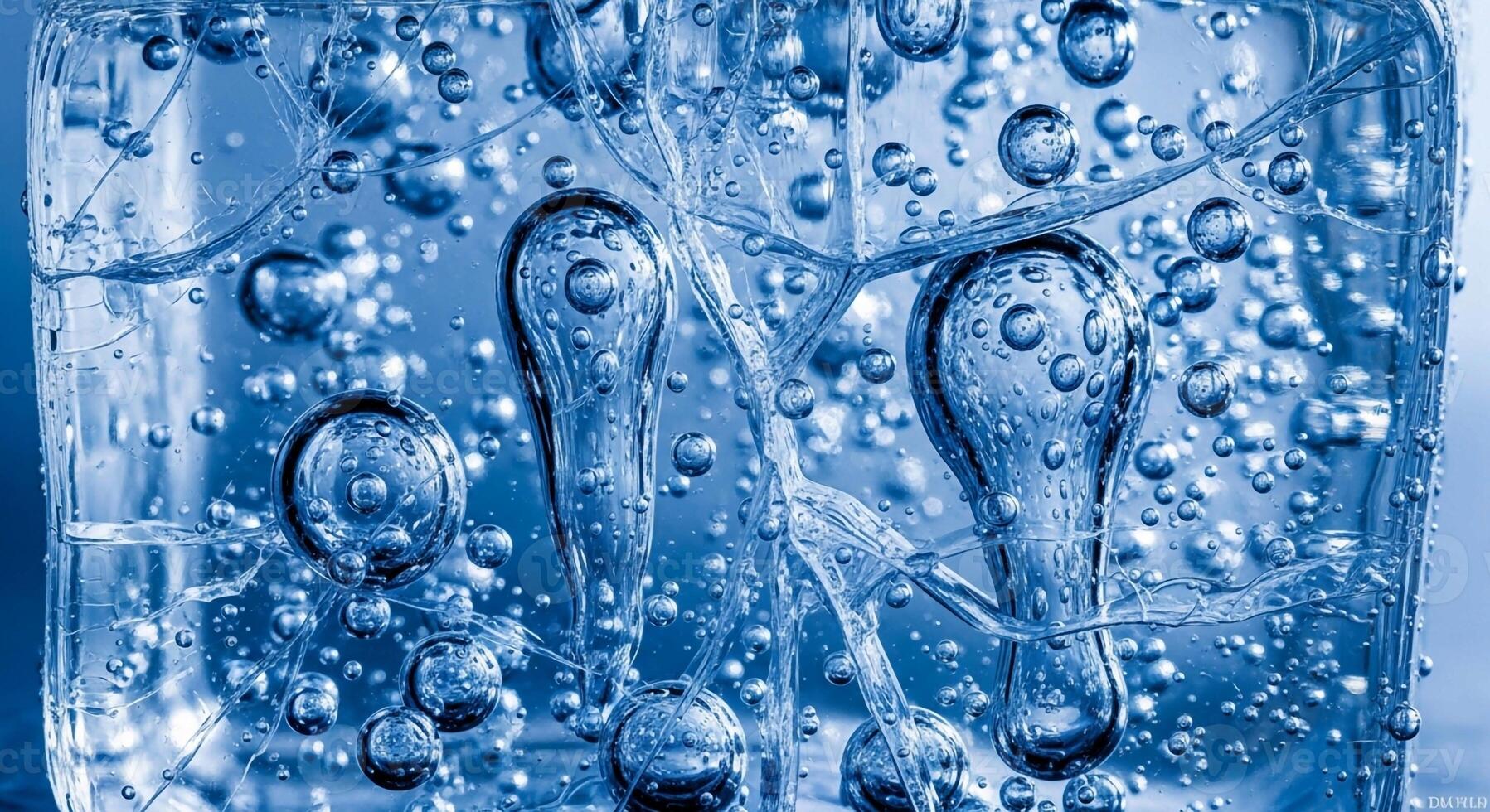 Abstract macro view of numerous small and large bubbles suspended within a clear blue liquid creating a dynamic and refreshing visual Pro Photo
