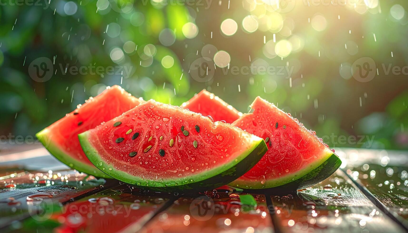 Ultra-realistic macro photo of fresh sliced watermelon on a wet wooden table under a gentle summer rain, with sparkling bokeh highlights Pro Photo