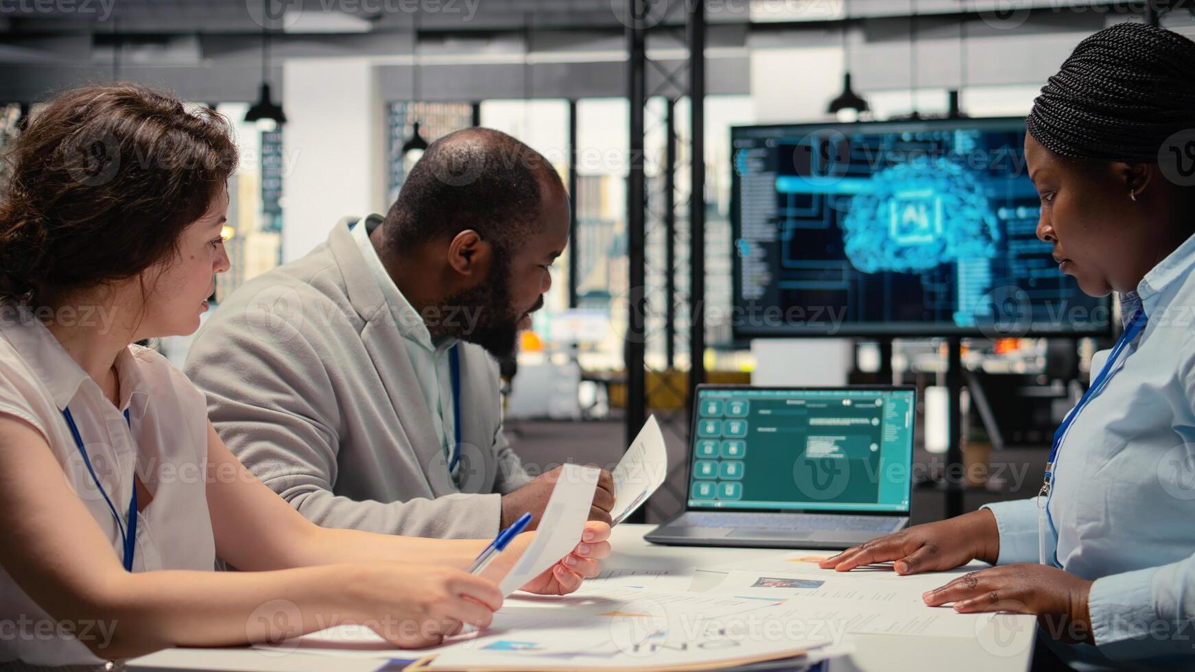 Recruiters reviewing feedback from artificial intelligence platform, using automation and deep learning to make informed hiring decisions and select suitable applicants for employment. Camera A. Pro Photo