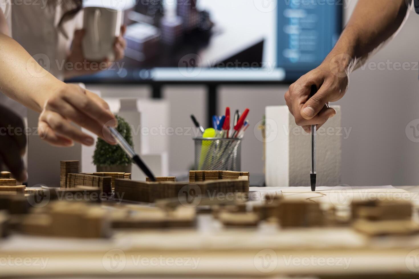 Close up of urban developers showing master plan for residential layout project, using 3D models on table to present idea of a smart city. Site preparation for infrastructure growth vision. Pro Photo