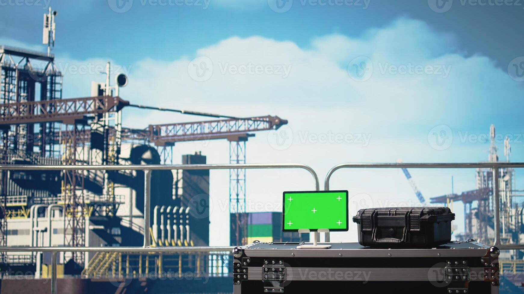 Green screen mockup tablet on drilling rig ship monitoring operations performance. Chroma key device on offshore platform deck with application used to control systems remotely, panning shot Pro Photo