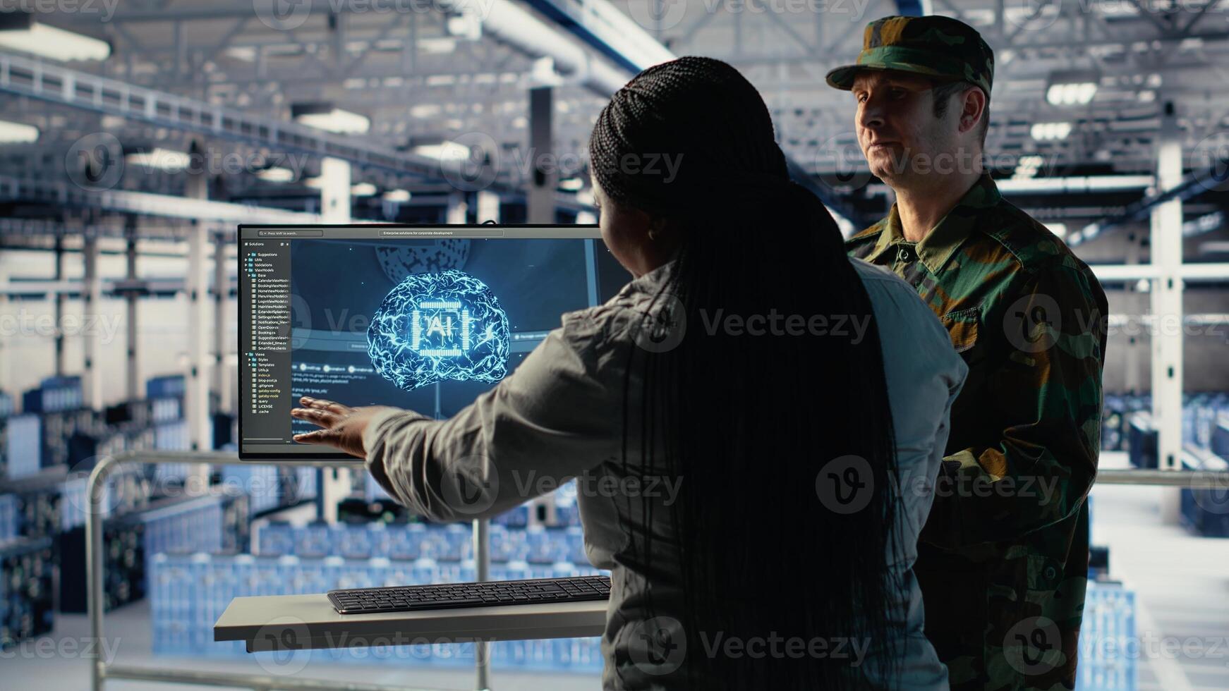Army experts in server room use artificial intelligence program to review reconnaissance information. Military data center colleagues run machine learning systems to prepare missions, camera B Pro Photo