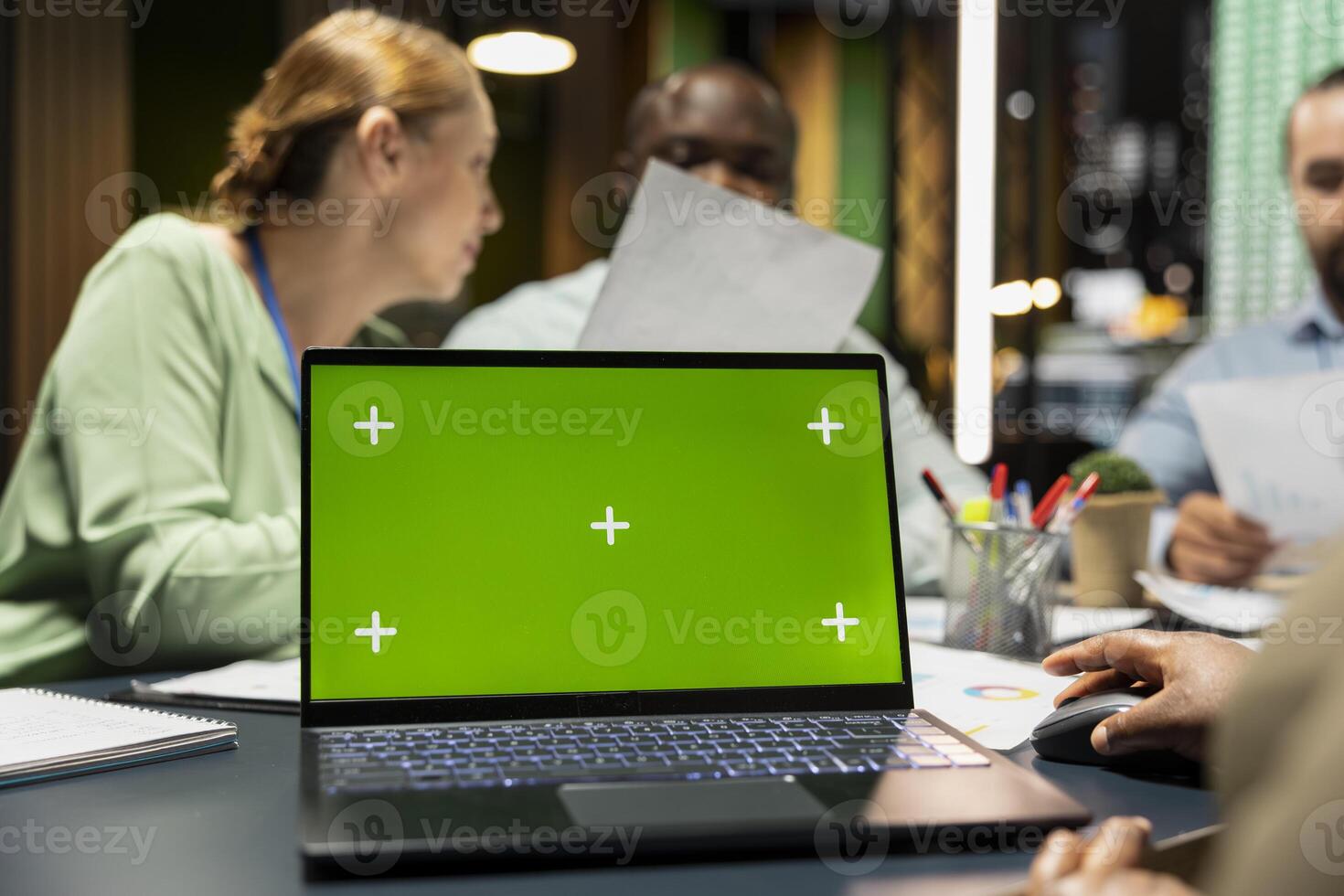 Workers group reviewing insights with chroma key after hours, analyzing annual trends and collaborating on project agenda supported by visual data. Business intel projections in a meeting. Pro Photo