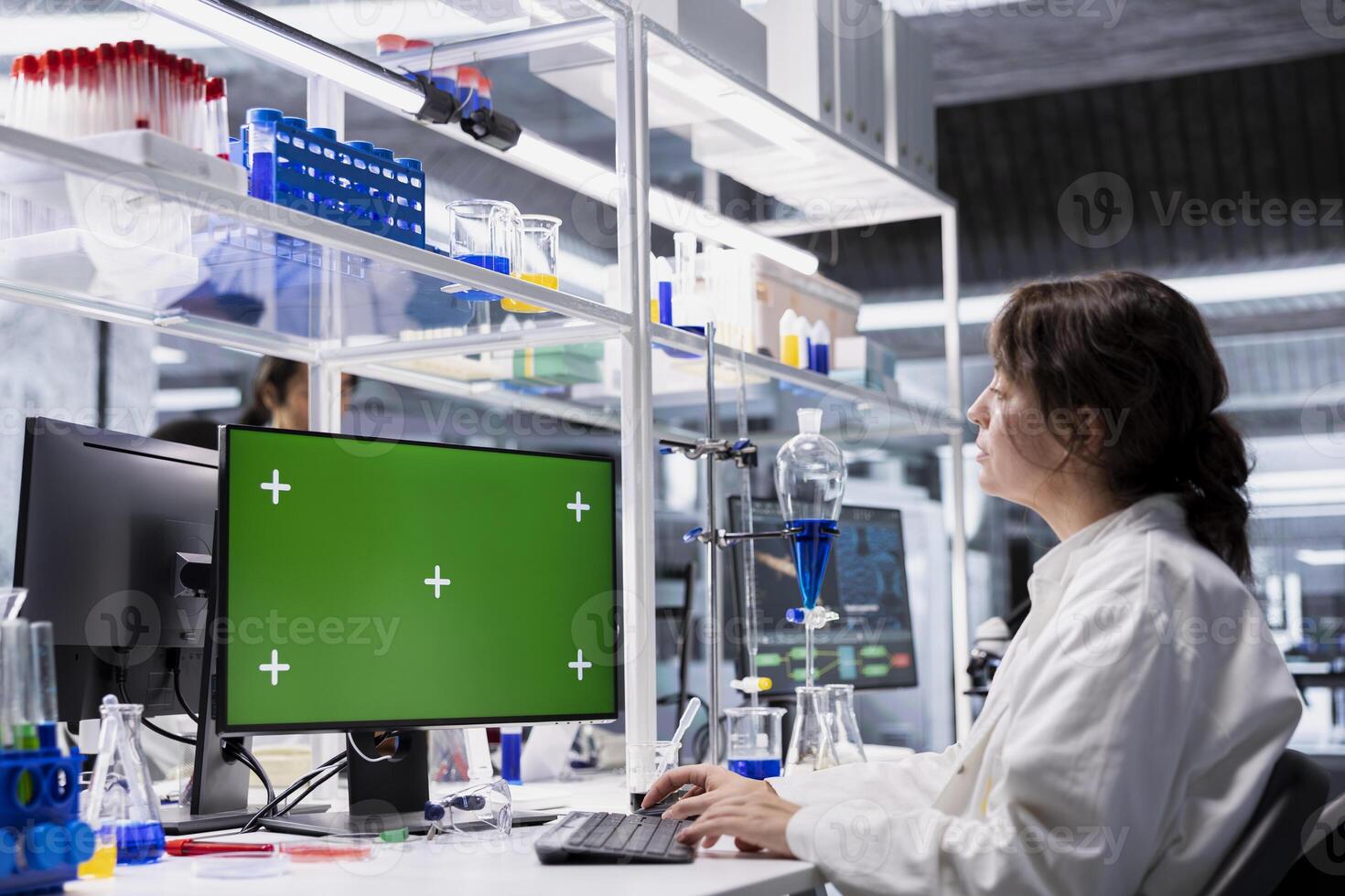 Lab technician looking at 3D molecular model visualization on green screen computer monitor. Woman using bioengineering software on chroma key PC in medical lab displaying DNA data, Pro Photo