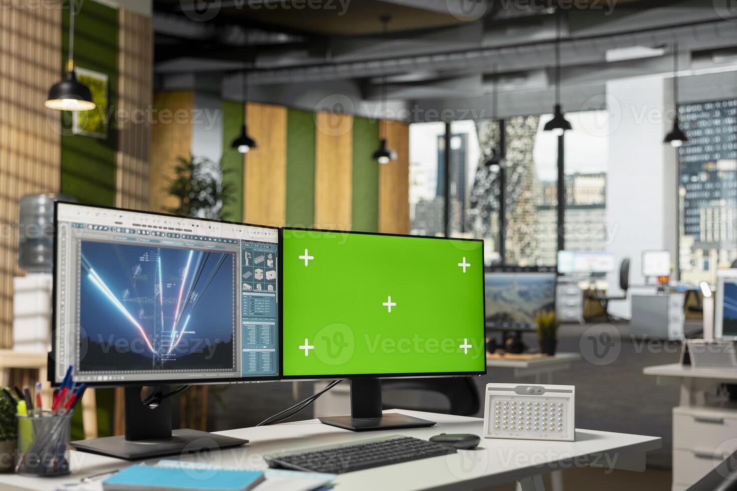 Electrical grid data on isolated screen PC in empty office used to identify energy audit findings. Transmission tower efficiency metrics analytics dashboard on chroma key computer monitor Pro Photo