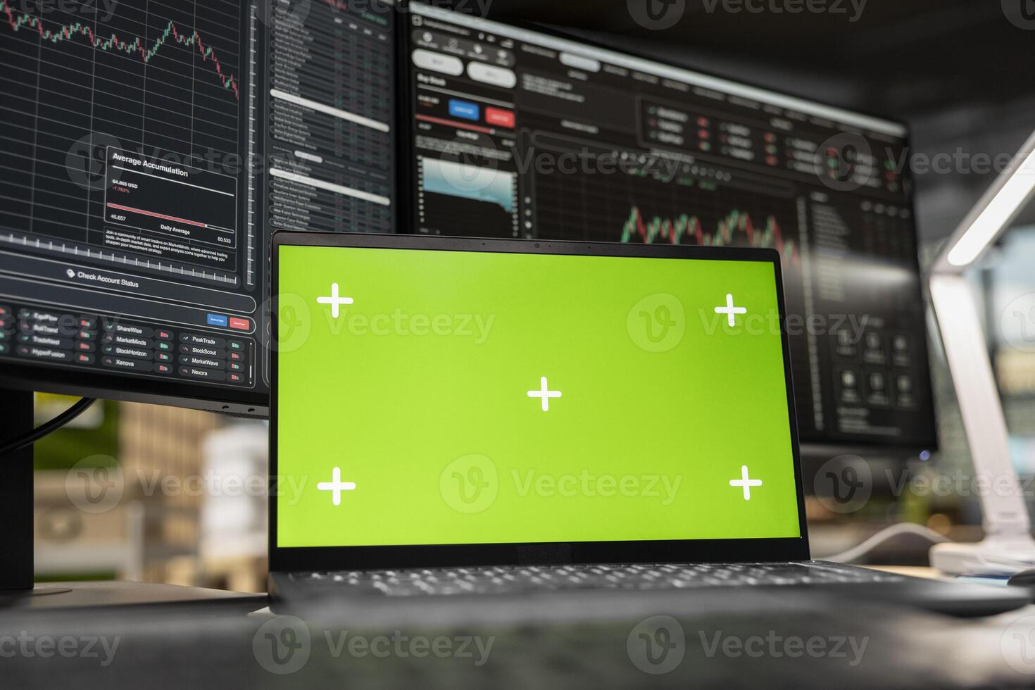 Close up of isolated screen laptop in brokerage office next to workstation monitor displaying live stock charts. Chroma key notebook device and PC with financial software in prop firm workspace Pro Photo