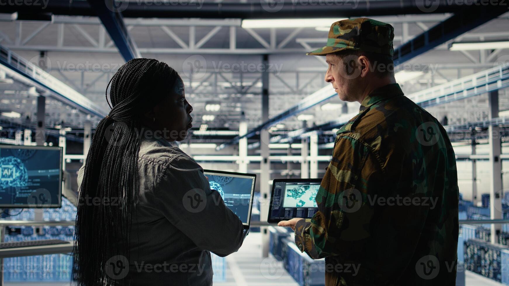 Military commander and female programmer in data center tracking coordinates using notebook software. Soldier and african american woman in server hub analyzing reconnaissance data, camera A Pro Photo