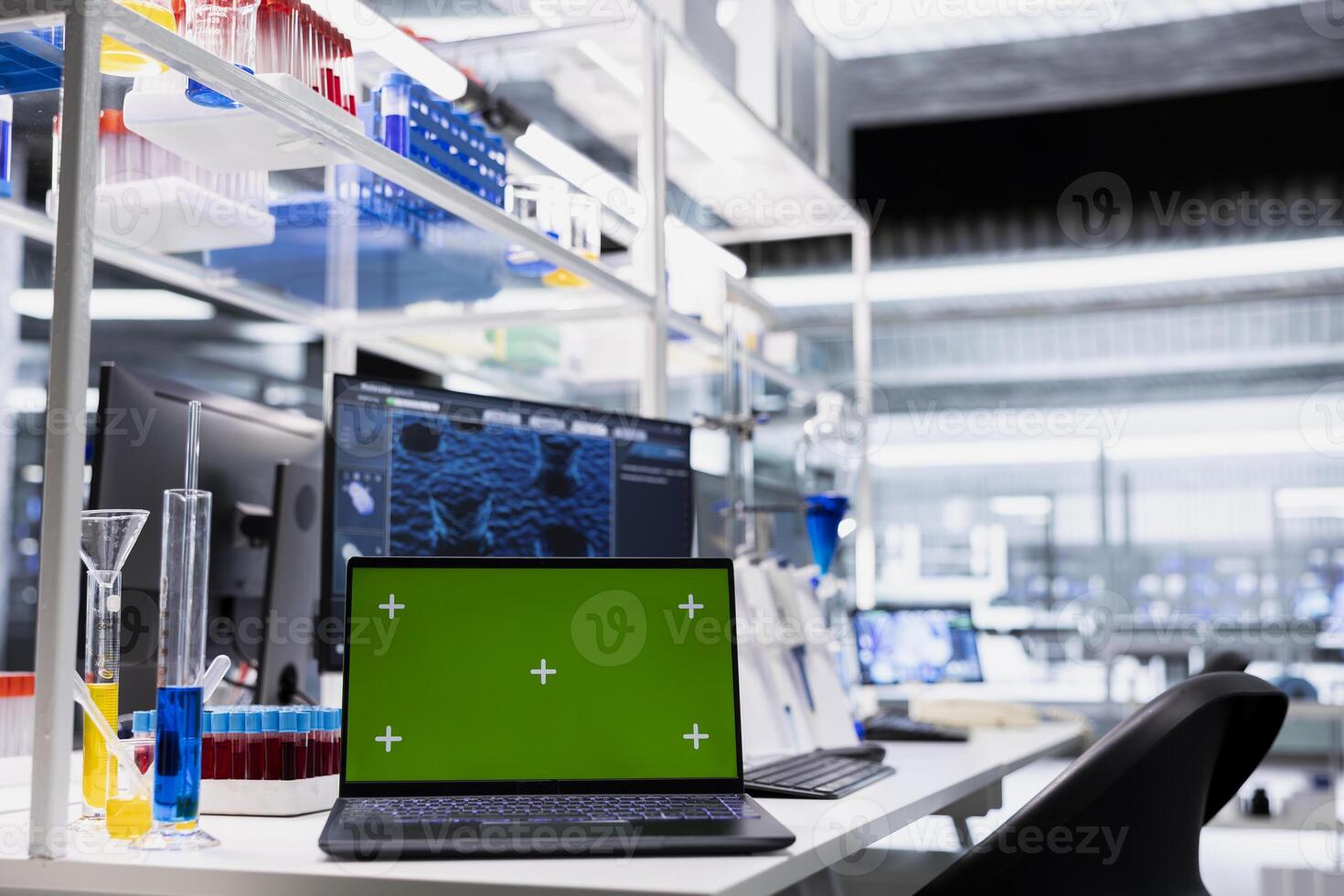 Green screen laptop and computer monitor in laboratory showing 3D molecular model visualization used for research. Mockup notebook and PC in medical lab displaying DNA data Pro Photo