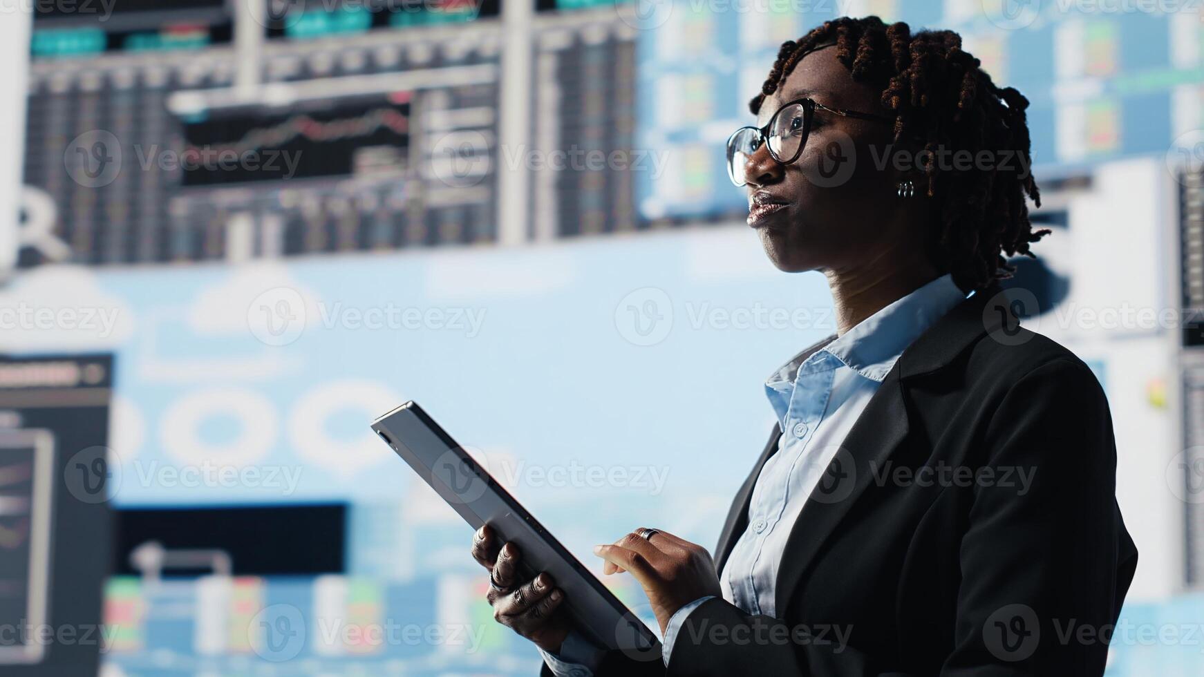 Business manager showing graphs on digital screens at event, telling audience how to increase company profits. Woman speaking in mic at conference, showing KPI metrics on digital screen, camera B Pro Photo