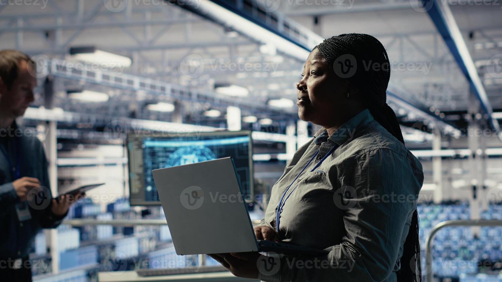 Data center supervisor on industrial platform working to improve AI rigs processing speed. African american server hub manager overseeing gear supporting artificial intelligence workloads, camera B Pro Photo