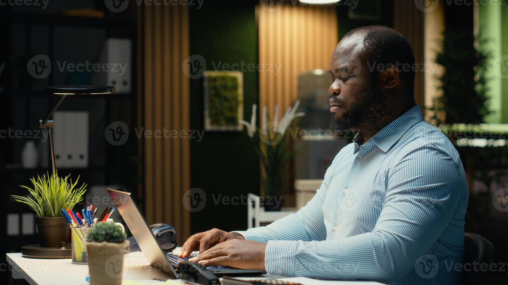Portrait of black male analyst smiling and working late after hours, reviewing data insights to meet business goals, solving budgeting tasks at night and fact checking documents. Pro Photo