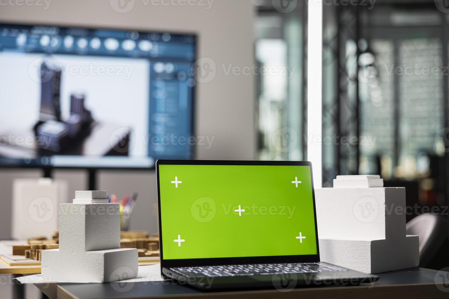 Empty desk layout in architectural real estate office with chroma key, building project preparation featuring property search documents and blueprints. Zoning regulations for approval. Pro Photo