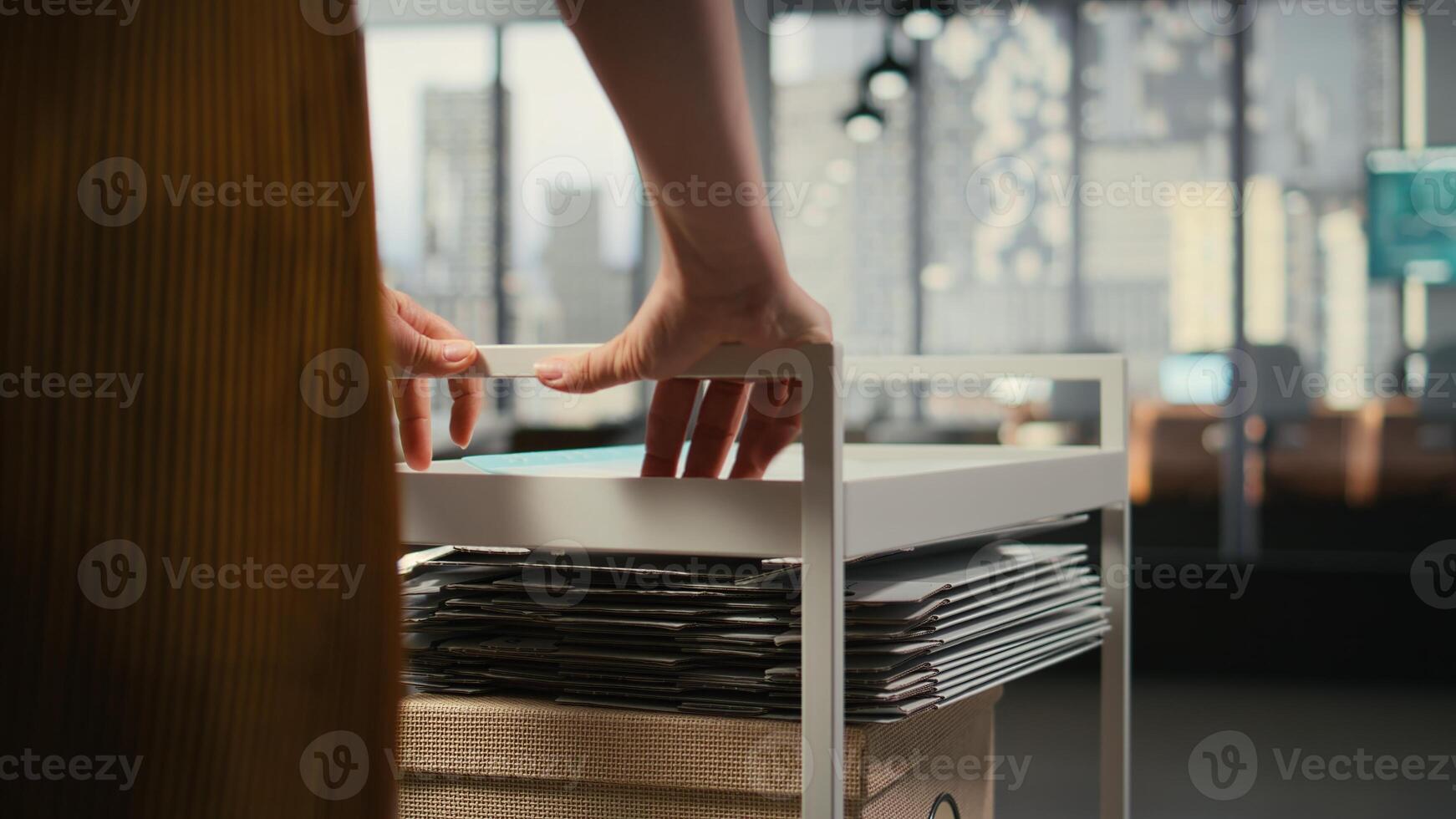 Close up of office secretary pushes a trolley filled with paperwork and documents, bringing files to a colleague and ensuring efficient distribution of resources. Workplace support. Pro Photo