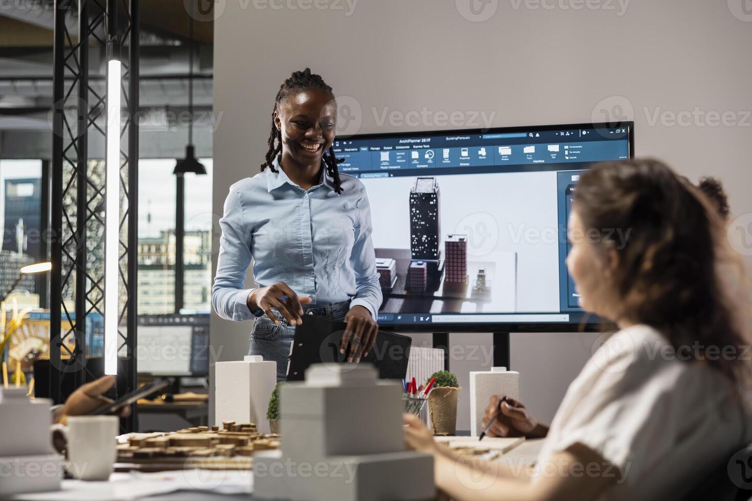 Multiethnic architecture developers team using 3D models in a brainstorming meeting, shows architectural software to work on structural city planning. Residential project for urban development. Pro Photo
