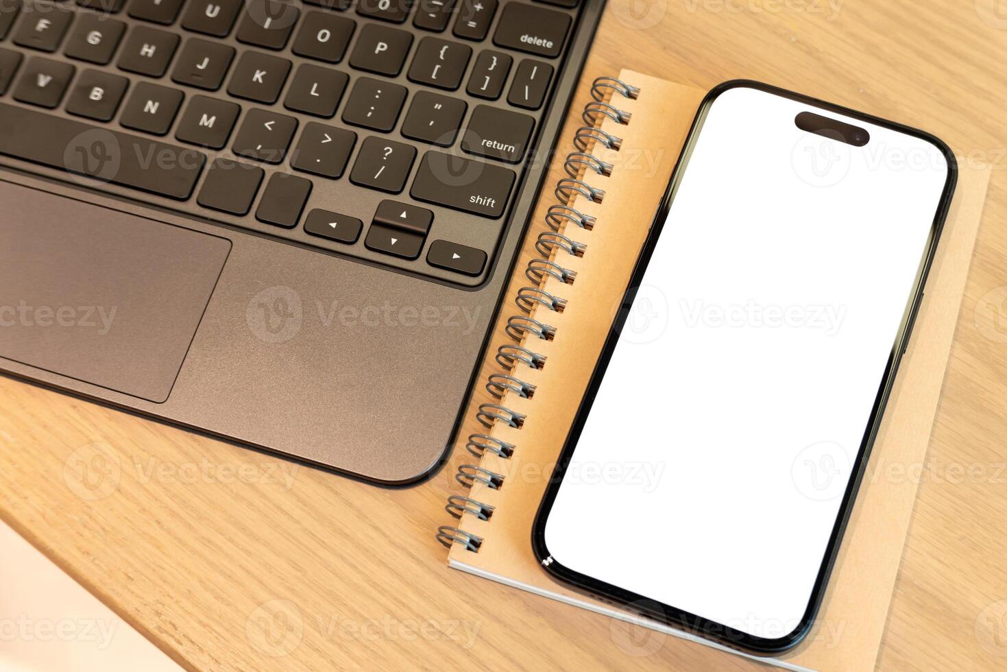 Blank Smartphone Screen on Notebook Beside Laptop. modern work, study, and business environments. mobile app mockups, educational content, UI UX designs, or representing remote work and planning. Pro Photo