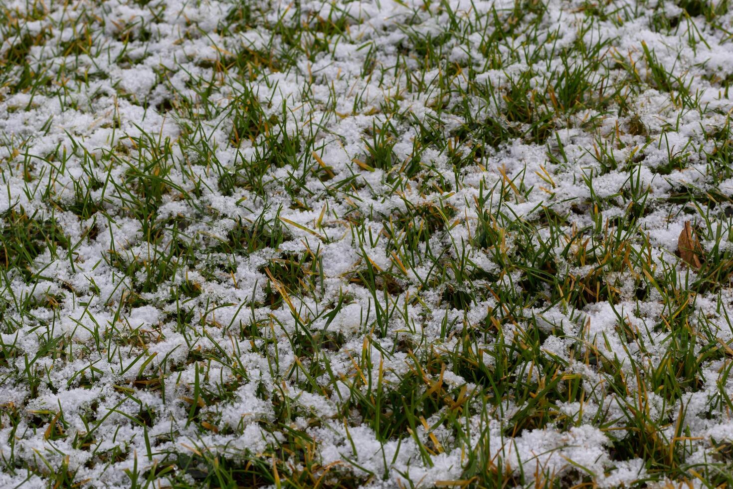 Green grass under first white snow background, pattern texture for use in print design Pro Photo
