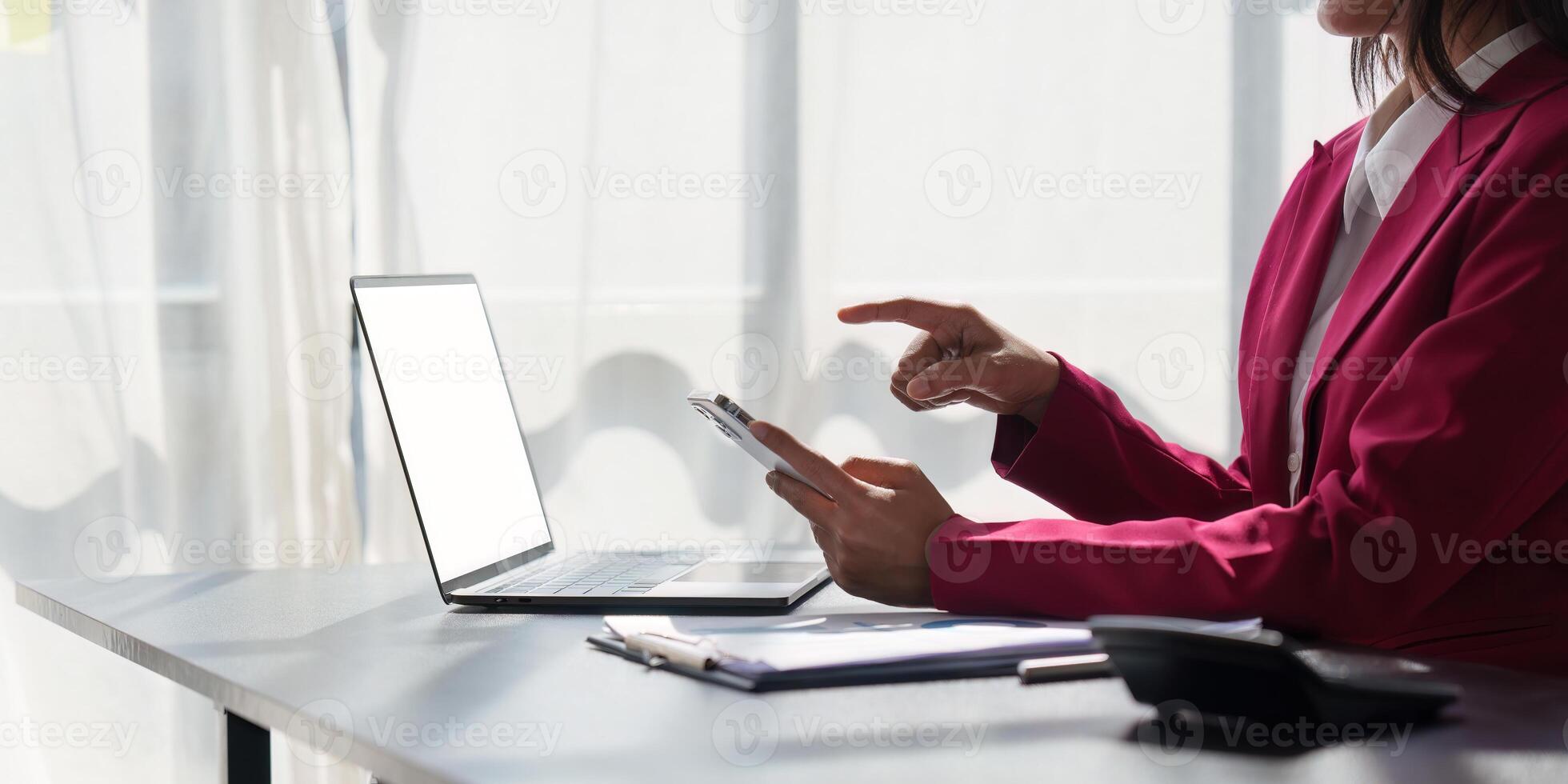 Chatbot Chat with AI, Artificial Intelligence. Business woman using technology smart robot AI. Futuristic technology transformation Pro Photo