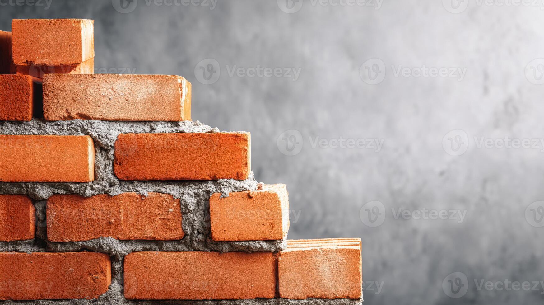 Close-up of red brick and mortar wall being built on a gray background with copy space Pro Photo