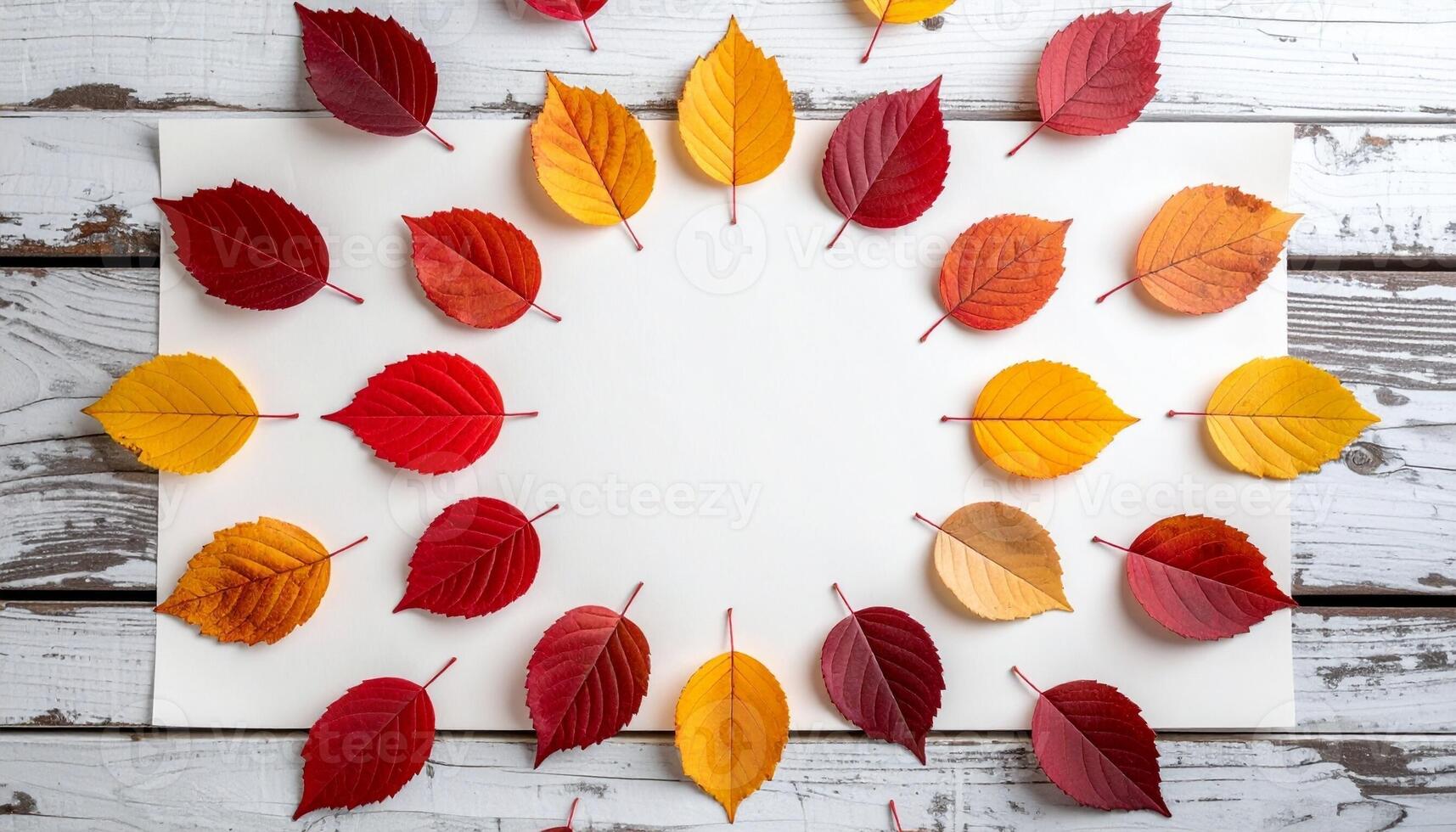 Autumn background with colorful fall leaves framing a blank white paper on a rustic wooden table. Top view with copy space. Pro Photo