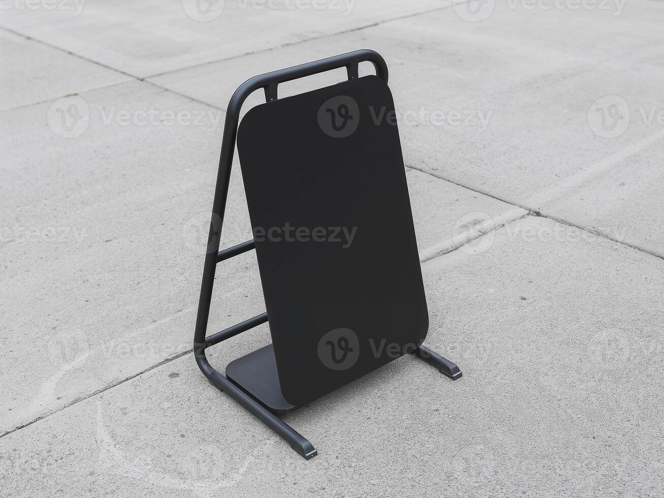 Blank black A-frame sign mockup standing on a concrete floor. Empty vertical sandwich board for menu or message display. Pro Photo