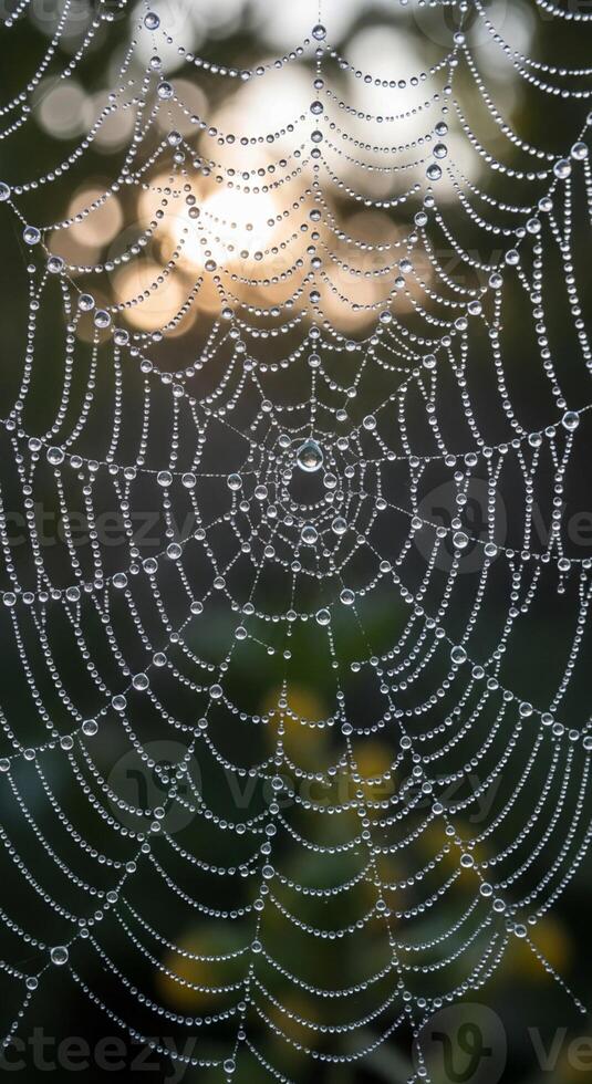 Intricate spiderweb adorned with dewdrops reflecting soft bokeh lights in a dark natural setting Pro Photo