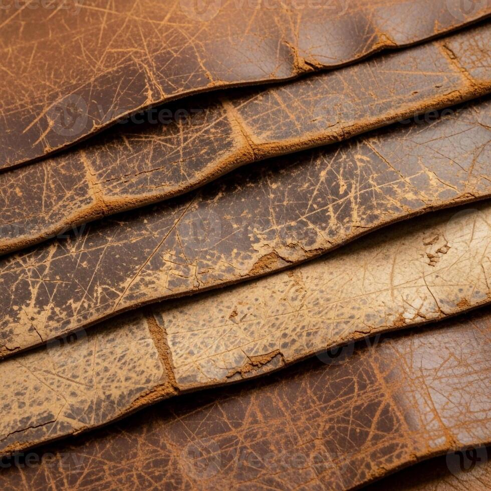 Close up abstract view of weathered and distressed brown leather strips creating a textured and rustic background pattern Pro Photo