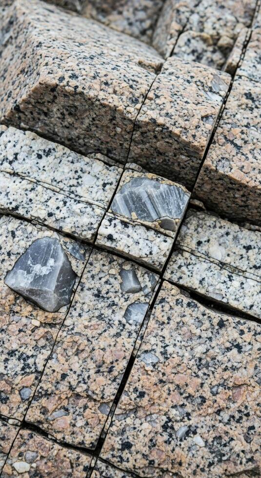 Close up view of weathered granite rock with distinct mineral veins and a small crystal fragment embedded within its textured surface Pro Photo
