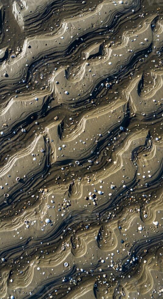 Abstract close up view of textured layered earth with distinct parallel striations and small scattered pebbles creating a natural organic pattern Pro Photo