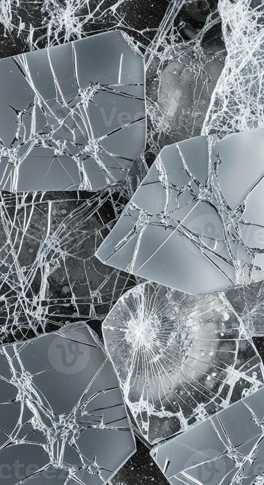 Close up abstract view of shattered glass with intricate web like cracks and sharp fragments reflecting light Pro Photo