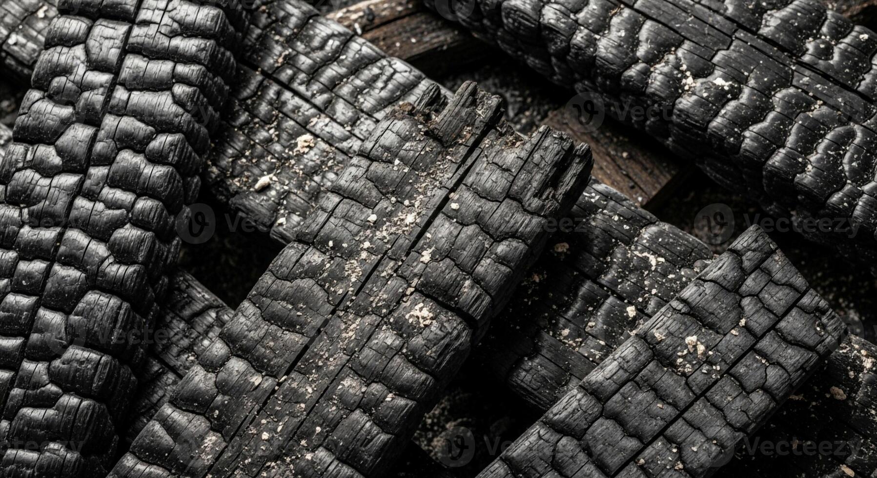 Close up abstract texture of charred wood logs showing deep cracks and rough grain patterns from intense heat Pro Photo
