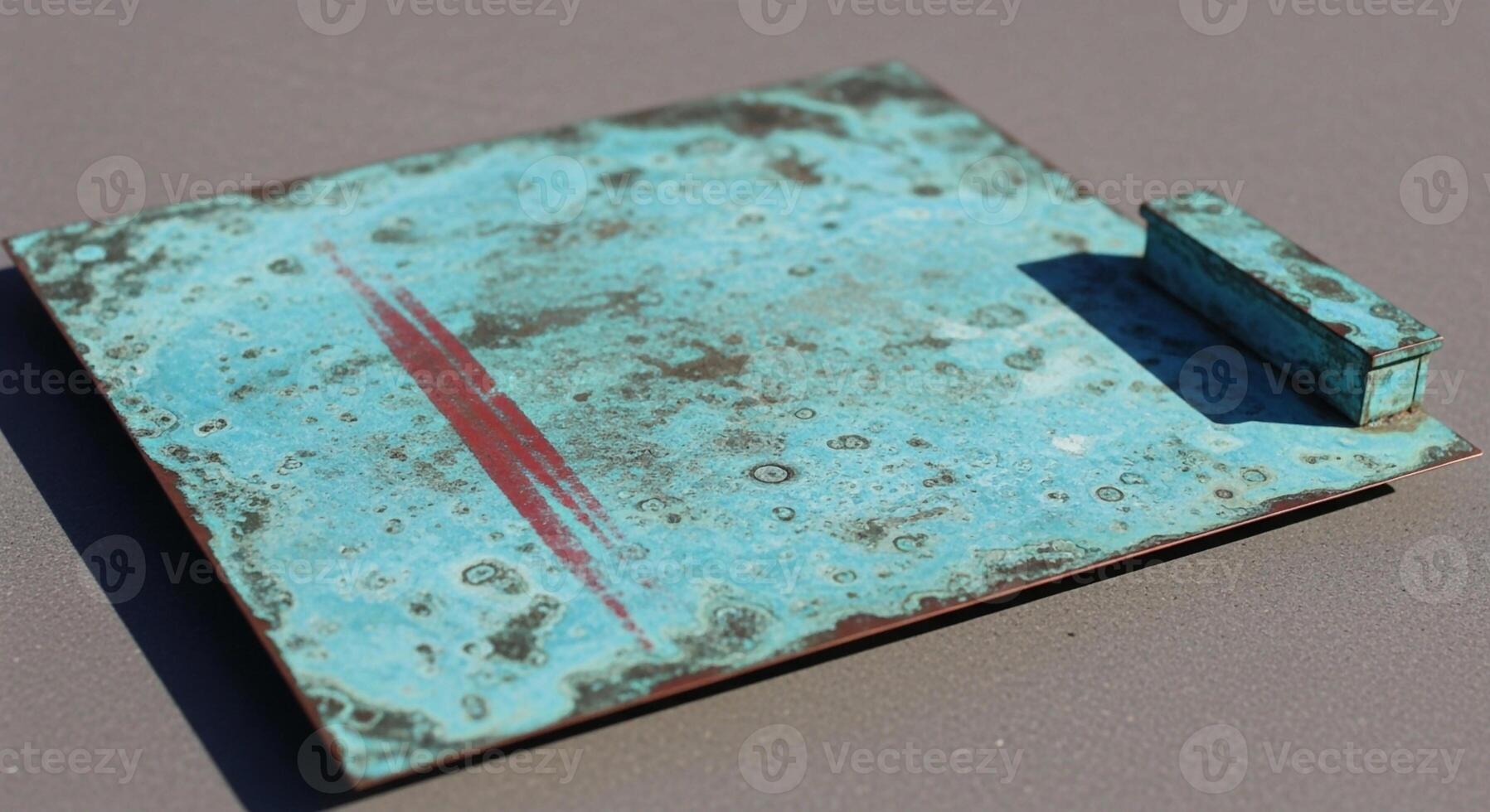 A weathered verdigris patinated copper tray with a raised rectangular handle and a subtle red accent line Pro Photo