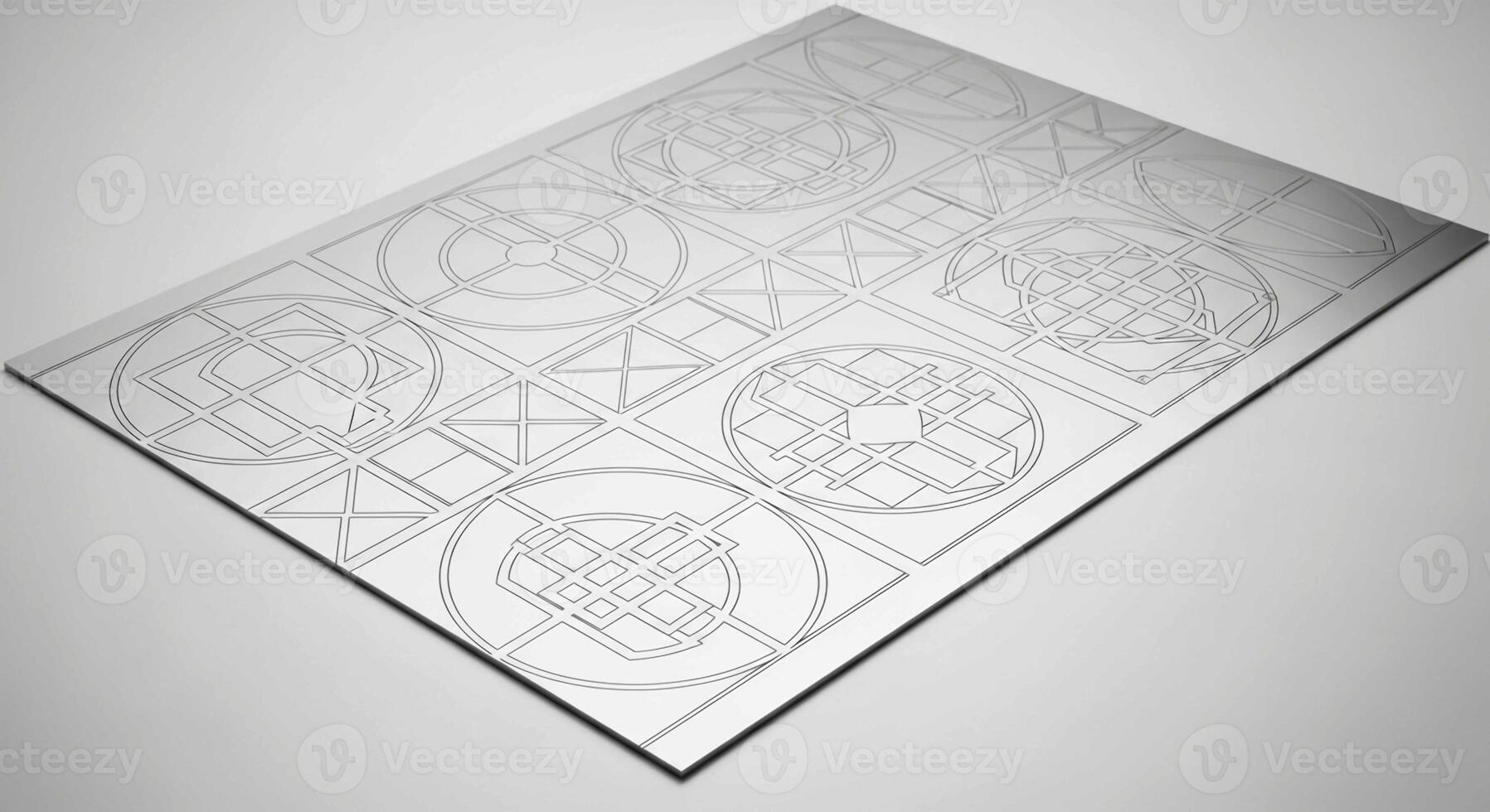 Intricate geometric sacred geometry patterns etched on a metallic surface with subtle reflections and shadows Pro Photo