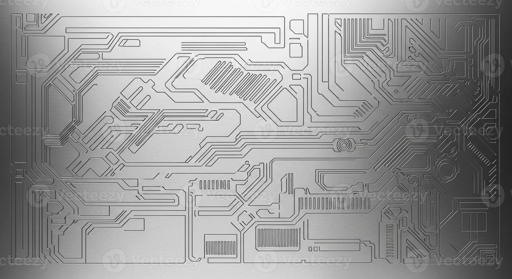 Intricate etched metallic surface with complex circuitry patterns resembling a futuristic motherboard or microchip design Pro Photo