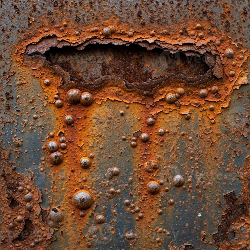 Close up macro view of heavily rusted metal surface with peeling paint and dripping oxidation patterns Pro Photo